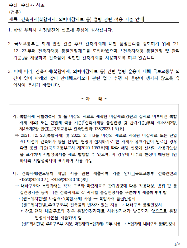 Á¦¸ñ °ÇÃàÀÚÀç(º¹ÇÕÀÚÀç,¿Üº®¸¶°¨Àç·á µî) ¹ý·É °ü·Ã Àû¿ë ±âÁØ ¾È³»